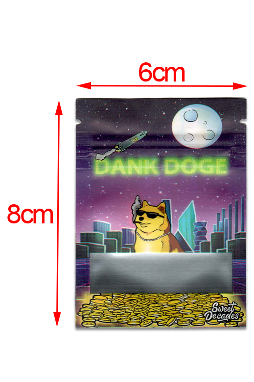Cali Bag „Dank Doge“ – 6 × 8 cm, Vorderseite mit Sichtfenster, Rückseite ohne; Zip-Verschluss + heißsiegelfähiger Rand, Mylar/PE innen silbern, lichtdicht & geruchsreduzierend.