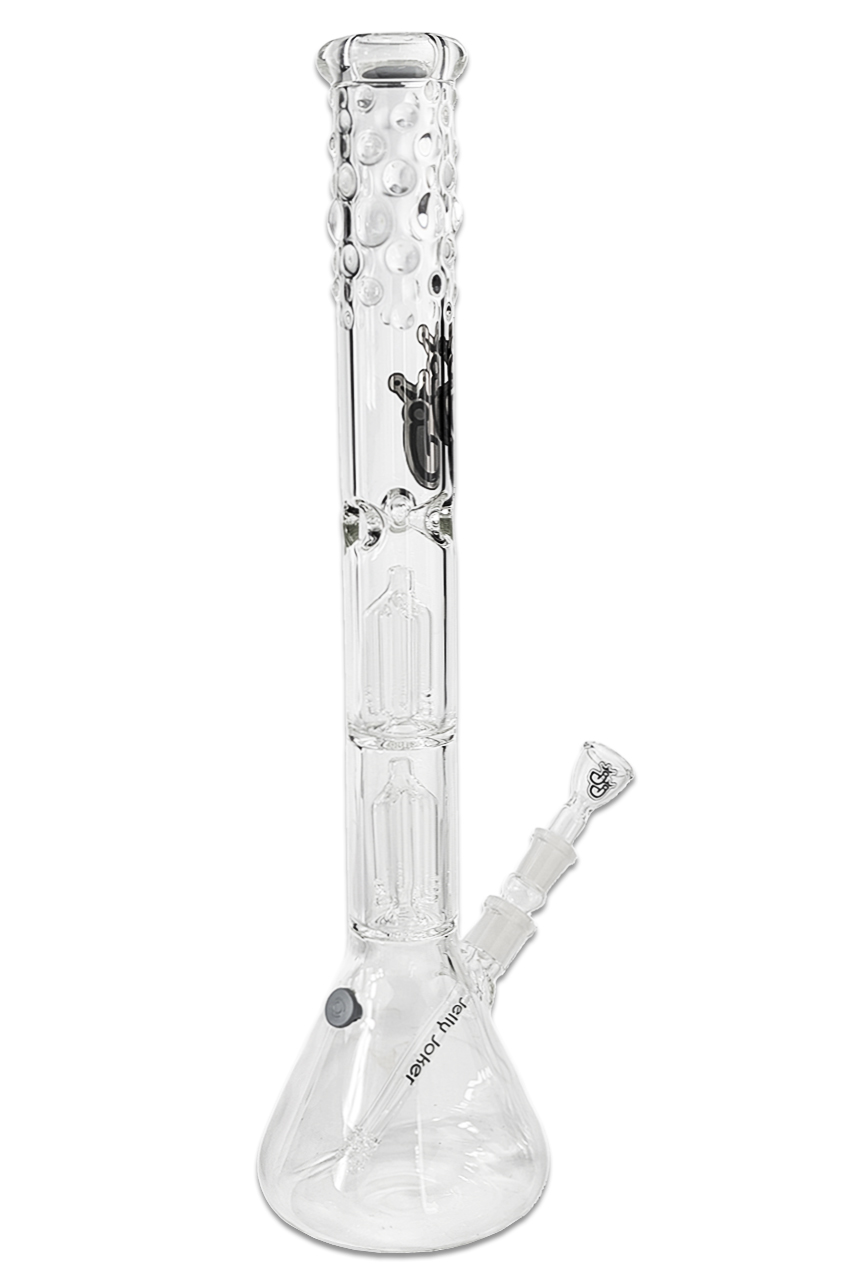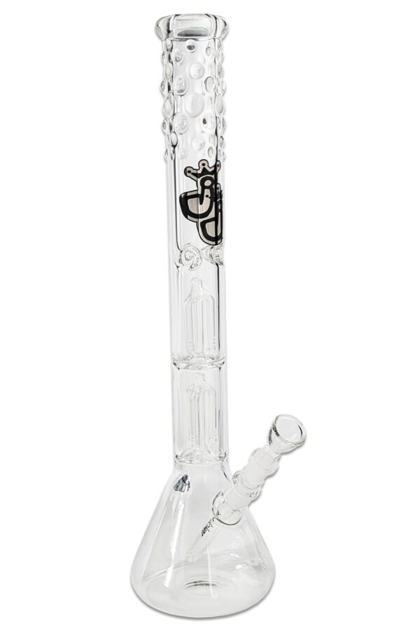 Optisch fällt die Bong durch die Perlen-Verzierung am Hals auf. Technisch überzeugt sie mit zwei 3-Arm-Perkolatoren und Eiskerben für eine starke Filterung und Abkühlung. Das Kickloch ist mit einem Kickloch-Gummi ausgestattet. Das Stecksystem verfügt über einen Lochdiffusor und 2 × 18,8mm Schliff für eine passgenaue Verbindung.