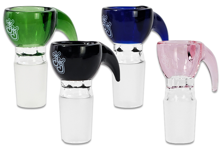 Diese bunten Köpfchen mit Griff bestehen aus durchgefärbtem Borosilikatglas und passen mit 18,8mm Schliff auf viele Glasbongs. Mit ca.6cm Gesamthöhe (inkl. Schliff) sitzen sie kompakt und stabil im Setup.