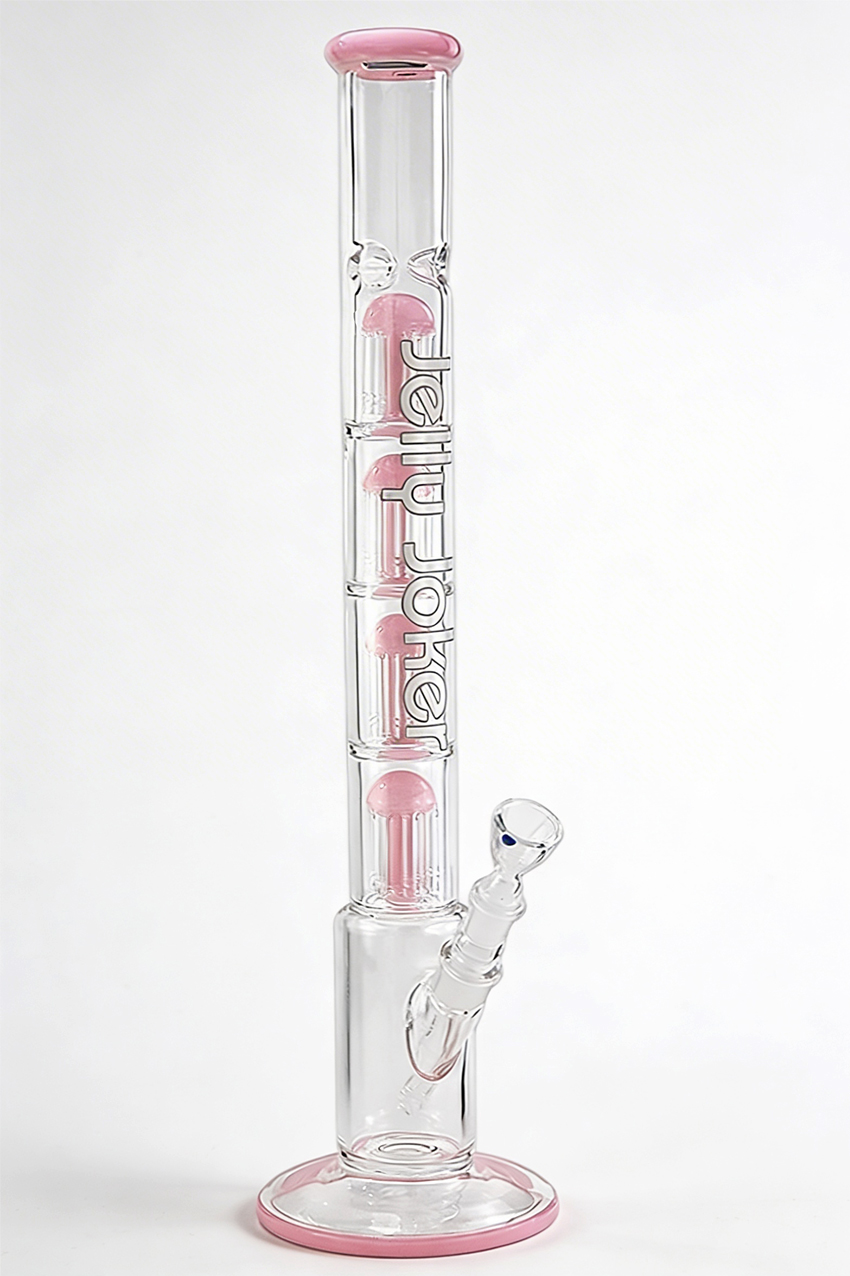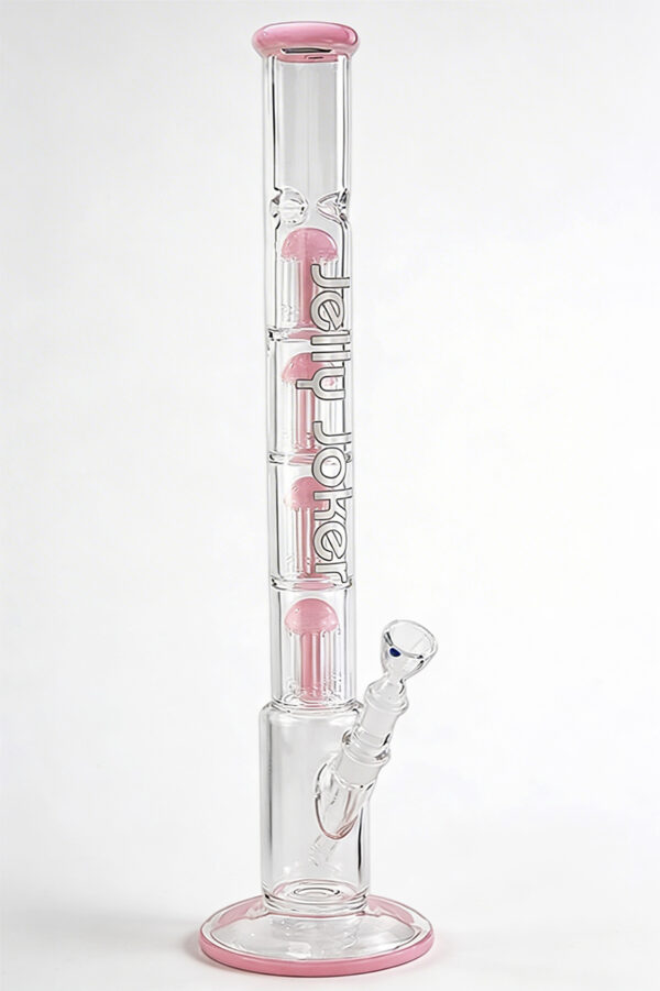Die Pink Poppet ist eine auffällige Glasbong mit 58cm Höhe und pinken Details aus durchgefärbtem Glas am Fußrand und Mundstück. Auch die Perkolator-Kuppen sind pink abgesetzt – das macht die Bong optisch besonders markant.