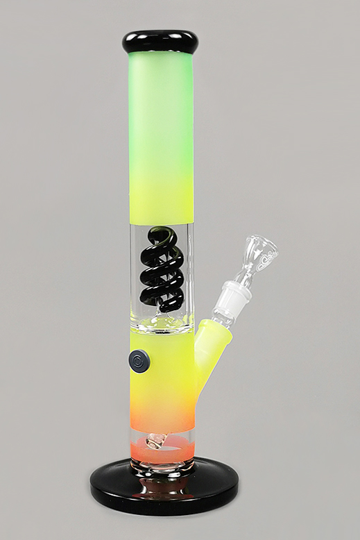 Rasted Bong: 38cm, 5mm Borosilikatglas, 18,8mm Schlitz-Diffusor-Stecksystem, schwarze Kühlspirale und Kickloch – Design und Funktion in einem Setup.
