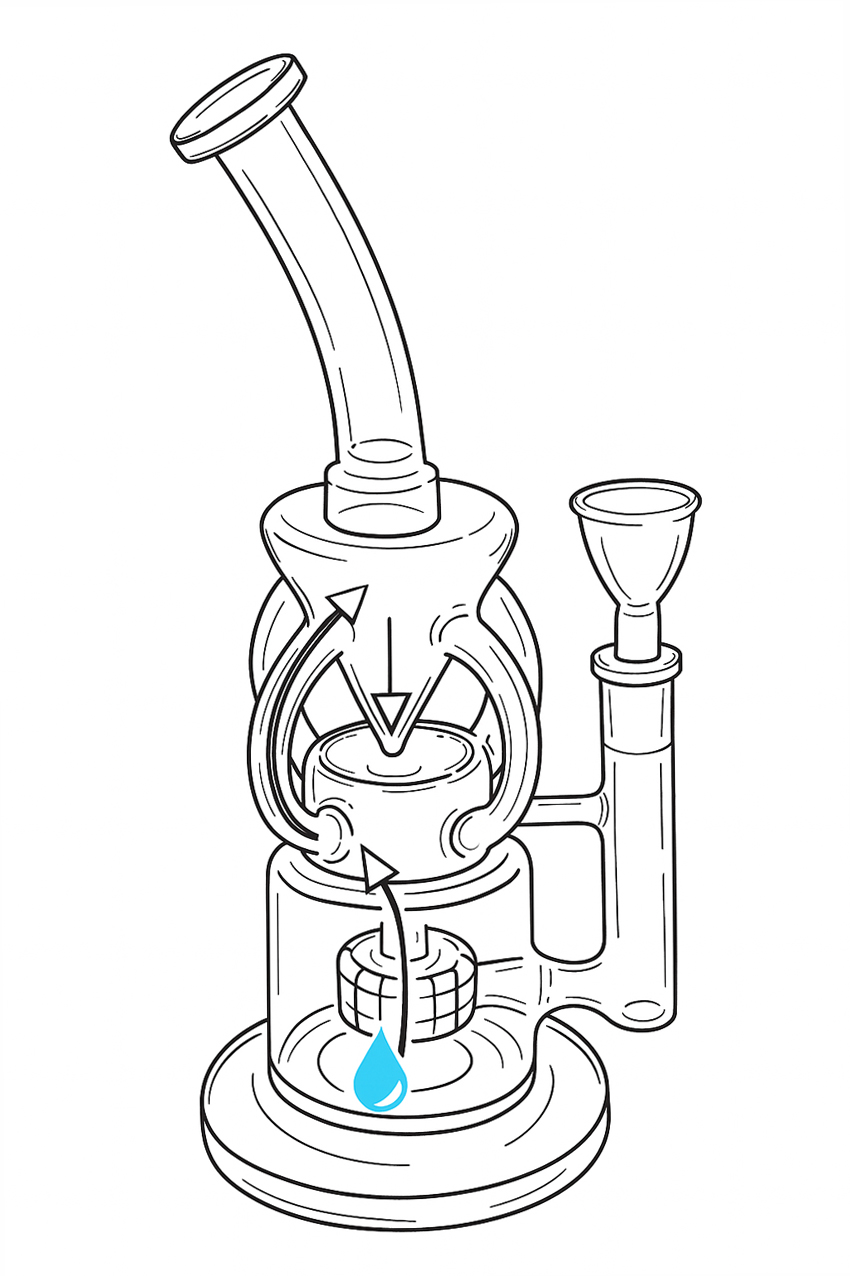 Der Watercycler arbeitet mit einer sichtbaren Wasserzirkulation: Der Wheelperkolator wirbelt das Wasser auf, der Rauch steigt mit dem Wasser in die vier Arme, sammelt sich im Trichter und läuft zurück in die Hauptkammer. Das Ergebnis sind gleichmäßige, gekühlte Züge und ein klar strukturiertes Strömungsverhalten.