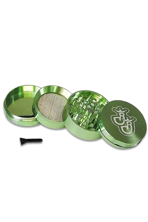 Der Cross Grinder in Grün bietet eine stabile Bauweise aus präzise CNC-gefrästem Aluminium. Das Pollinatorsieb wird ohne Gewinde eingesetzt und lässt sich schnell entnehmen. 55 scharfe Trapezzähne sorgen für ein sauberes und gleichmäßiges Mahlergebnis. Ein passender Schaber gehört zum Set.