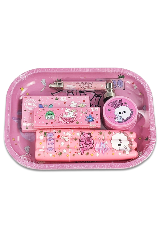 Komplettset Baked Bunny „4:20“ Pink – Grinder, Mini-Tray, 3er Cone Holder, Papers, Tips & Handpfeife