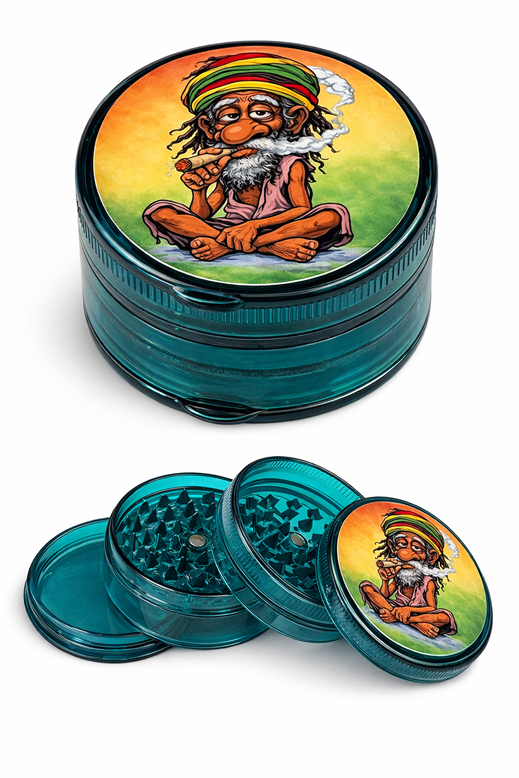 Der Ø60mm Kunststoff Grinder mit dem Motiv „Rasta Smoker“ verbindet einen klaren, funktionalen Aufbau mit einem markanten Comic-Design. Das Motiv zeigt eine stilisierte Figur mit Kopfbedeckung und Rauchmotiv vor grün-gelbem Hintergrund und sorgt für eine auffällige, gut erkennbare Optik.