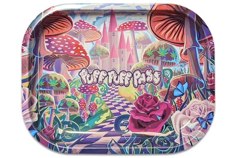 Das Rolling Tray im Fantasy-Castle-Design verbindet Funktionalität mit verspieltem Look. Mit 18 x 14 cm bietet es genügend Platz für entspanntes Drehen. Gefertigt aus robustem Metall und einseitig bedruckt, überzeugt es mit bunten Motiven aus Pilzen, Rosen und märchenhaftem Schloss.