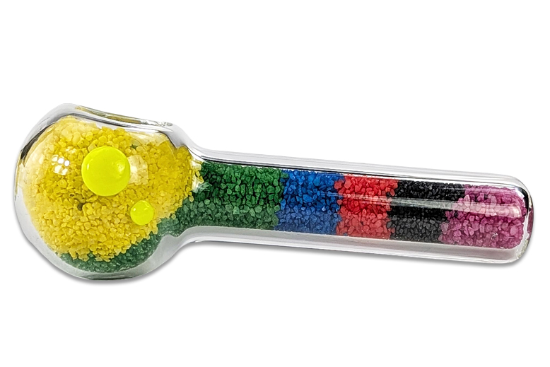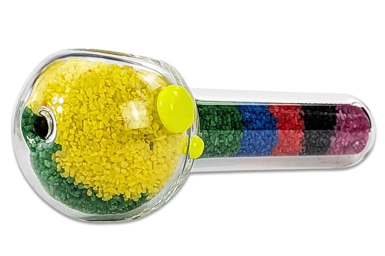 Diese Spoonpipe besteht aus starkem 5mm-Glas und ist mit farbigem Granulat gefüllt, wodurch jede Pipe eine individuelle Optik erhält. Die Verarbeitung ist stabil und das Design wirkt durch die klare Struktur hochwertig. Mit einer Länge von ca. 13,5 cm liegt sie gut in der Hand und das Kickloch befindet sich am hinteren Ende der Pipe.