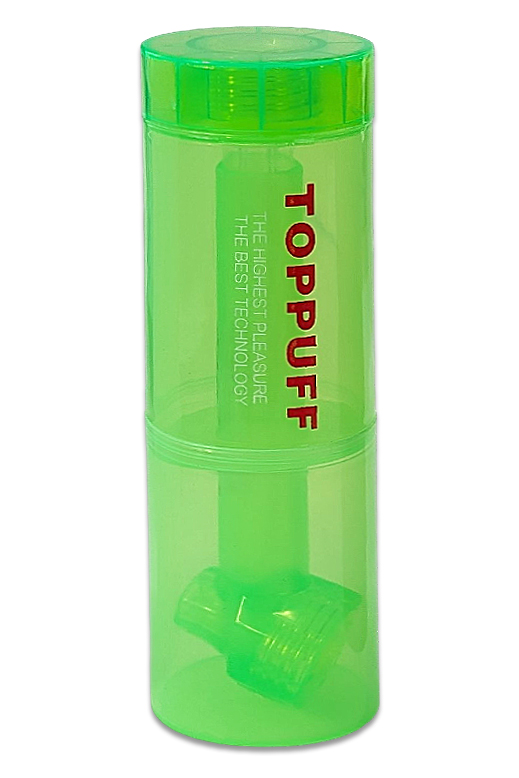Die Festival-Bong TOPPUFF in Grün bietet ein schlichtes, unauffälliges Design und bleibt dabei funktional und kompakt. Sie lässt sich schnell aufbauen, ist leicht zu transportieren und verfügt über ein integriertes Eisfach für angenehm kühlen Rauch.